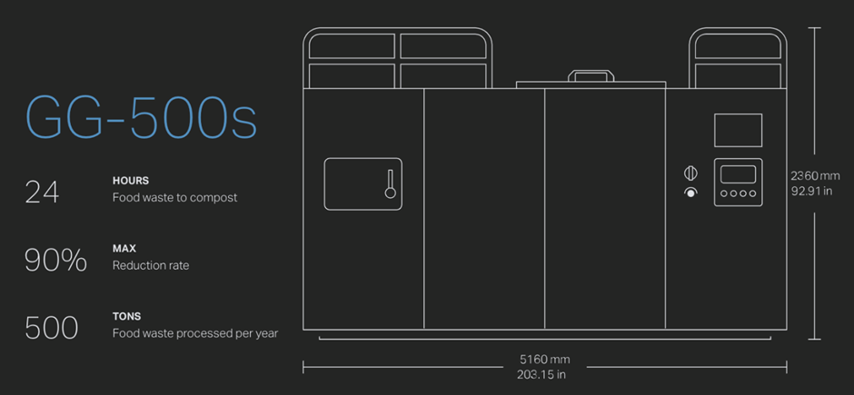 Oklin’s GG500s are ideal for businesses where a high volume of food waste is generated per day. The GG500s model series are ideal for commercial and industrial applications. It’s equipped with innovative features that simplify the operating procedure for an efficient waste reduction result. The infrared camera system keeps operators up to date on the composting process, and the bin lifter system allows for easy food waste input.