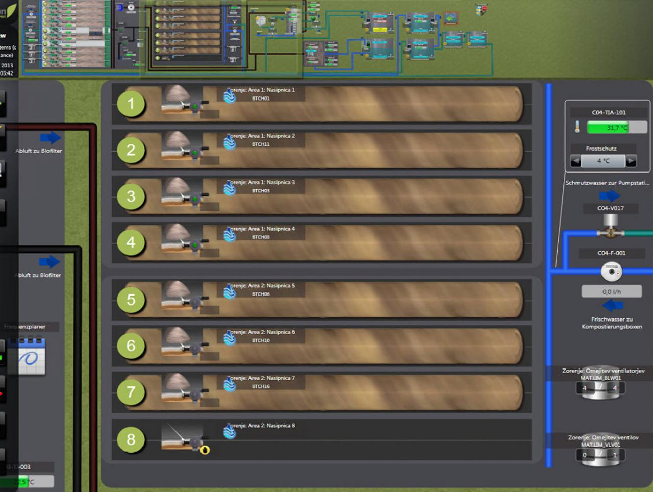 Our control technology is the shared control centre of the aeration system. Temperatures of the temperature monitoring system are read automatically, and the aeration time is individually controlled for each compost windrow depending on the specific process. A touch panel enables easy operation and parameter adjustment. In addition, the control technology is directly connected to visualization software. Changes of parameters are adopted in both systems. The compost control system is delivered as a pre-installed and pre-wired unit (IPC control, touch panel, motor protection switch, control cabinet, etc.).