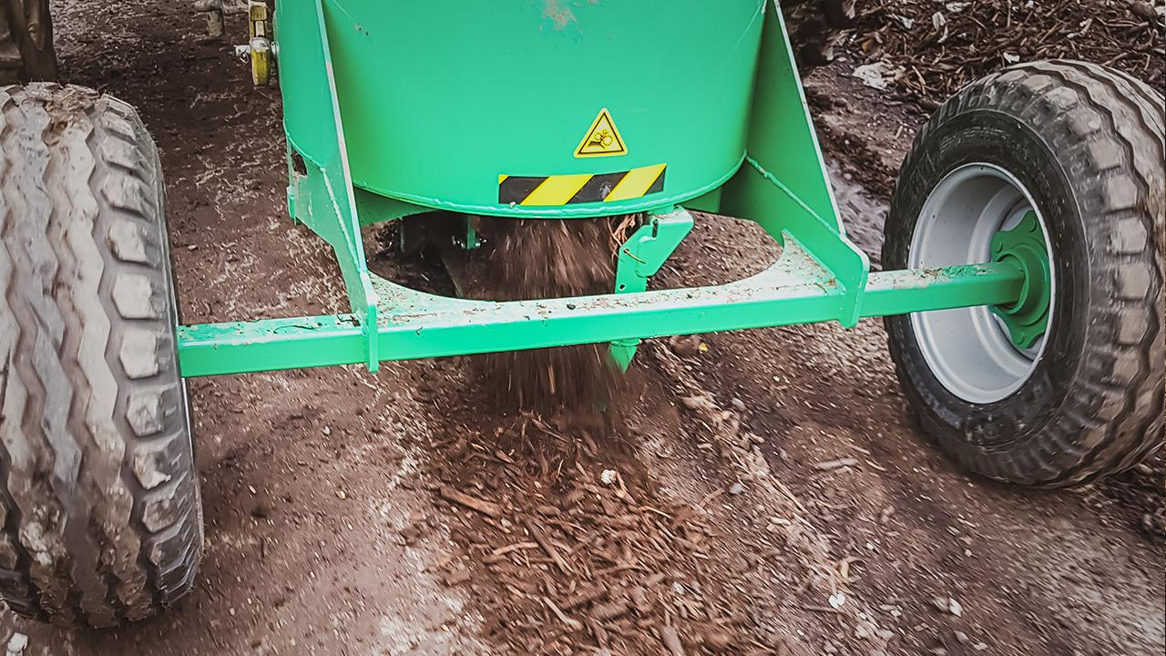 To prevent the clogging of the aeration pipes, wood chips are dispensed into the aeration trenches. These wood chips must be changed periodically. For this purpose, we have developed a machine that first cleans out the moist wood chips from the aeration trenches with a plow while dispensing fresh material at the same time. The trench cleaner is attached via the 3-point hitch of a tractor.